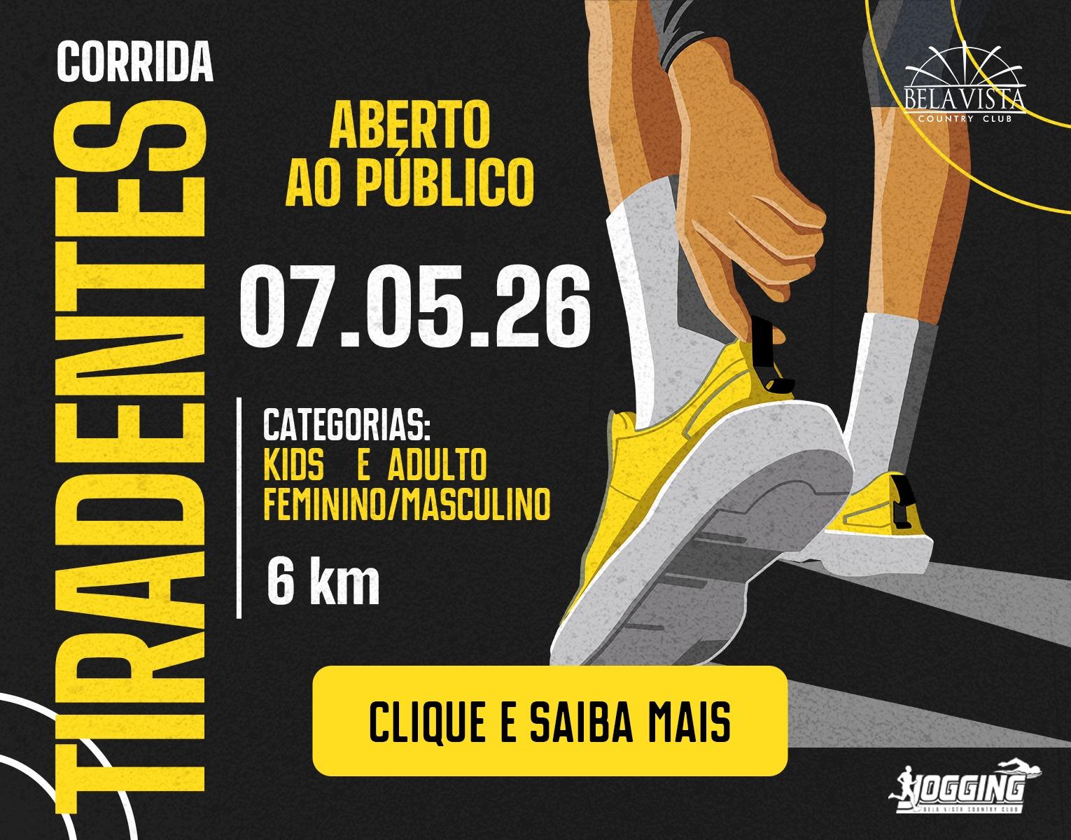 A Corrida de Tiradentes é a quarta prova do calendário do Jogging de 2026 e será realizada no dia 07 de maio de 2026, com largada às 19h30, na Pista de Jogging.