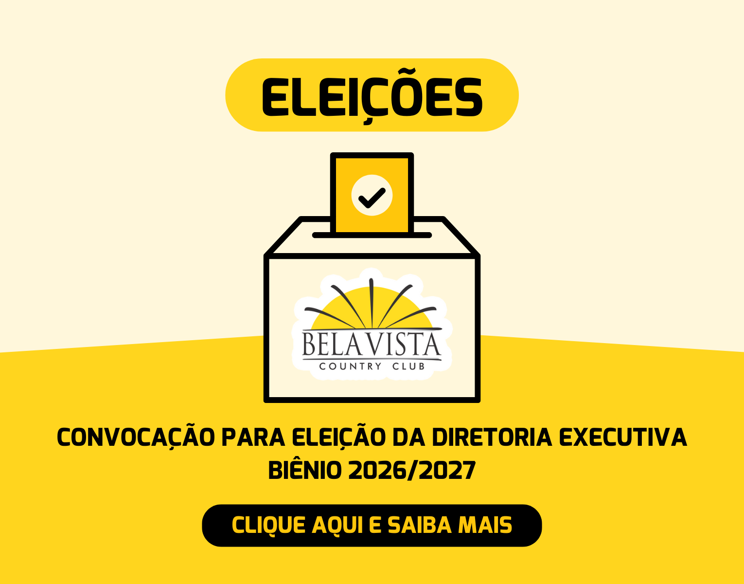 O Conselho Deliberativo do Bela Vista Country Club informa que a eleição da Diretoria Executiva para o biênio 2026/2027 será realizada no dia 17 de novembro de 2025, às 19h, mediante votação dos Conselheiros.